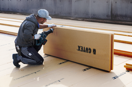 Les panneaux de sous-couverture Gutex Ultratherm et Gutex Multiplex-top répondent aux exigences d'une couverture provisoire à partir d'une pente de toit de 15° jusqu'à un RDN inférieur à 8° et jusqu'à trois exigences accrues sans collage supplémentaire ou couverture par film. Les panneaux sont affectés aux classes techniques UDP-A selon ZVDH.