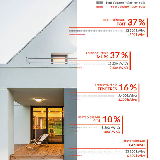 Régler le chauffage sur cinq n'est pas encore la panacée contre les moisissures. En effet, les champignons se développent sur les surfaces froides des murs, sur lesquelles se dépose l'humidité de l'air chaud du chauffage. Avec l'isolation en fibres de bois Gutex, vous assurez des murs chauds et ouverts à la diffusion et vous prévenez efficacement les moisissures et les courants d'air.