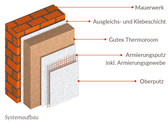 Het Intevio binnenisolatiesysteem bestaat uit de Thermoroom houtvezelisolatieplaat, die met Gutex-lijm en egalisatiepleister aan de binnenmuur wordt bevestigd. Het Gutex universeel wapeningsnet wordt in de volgende pleisterlaag ingebed.
